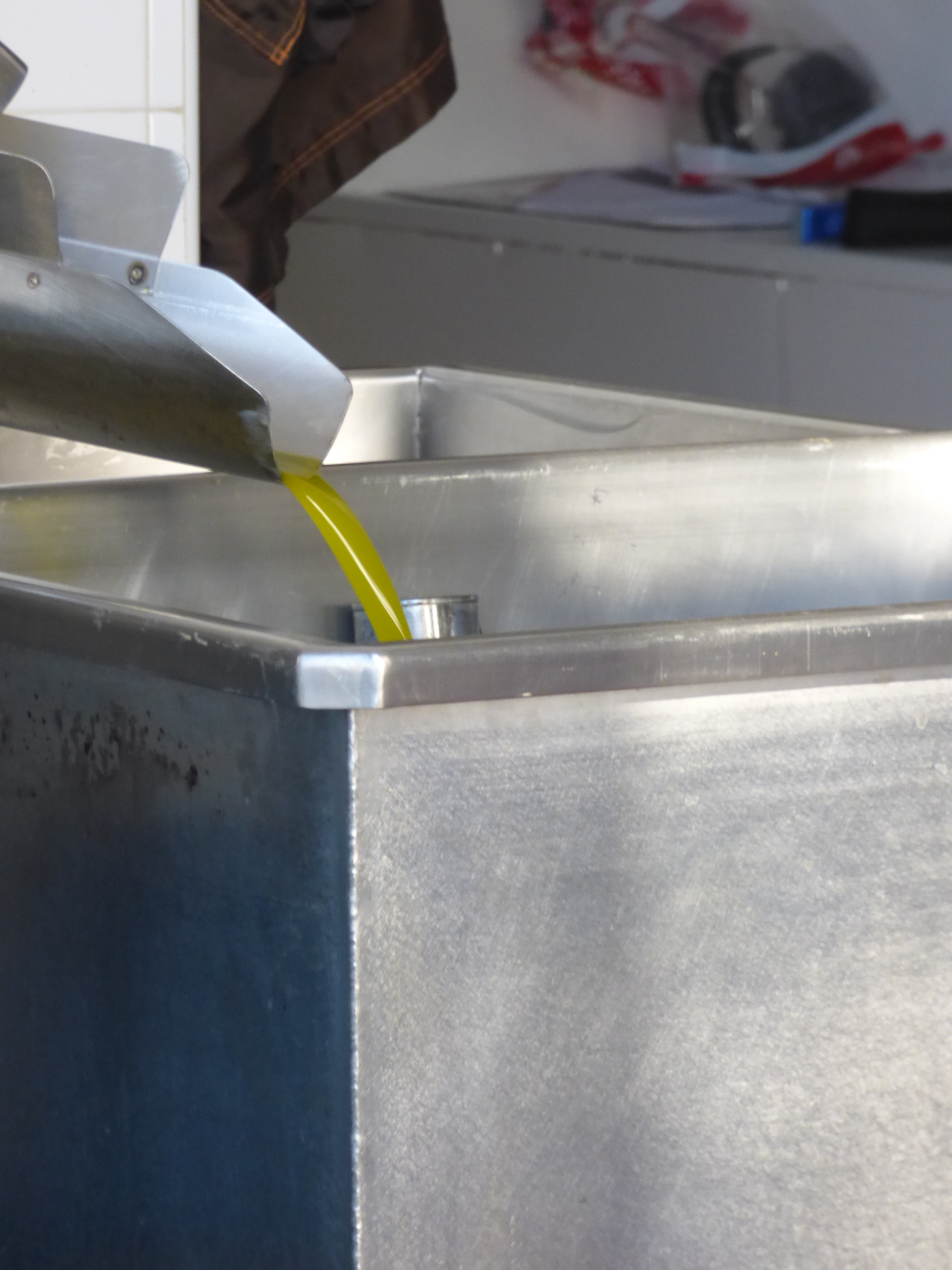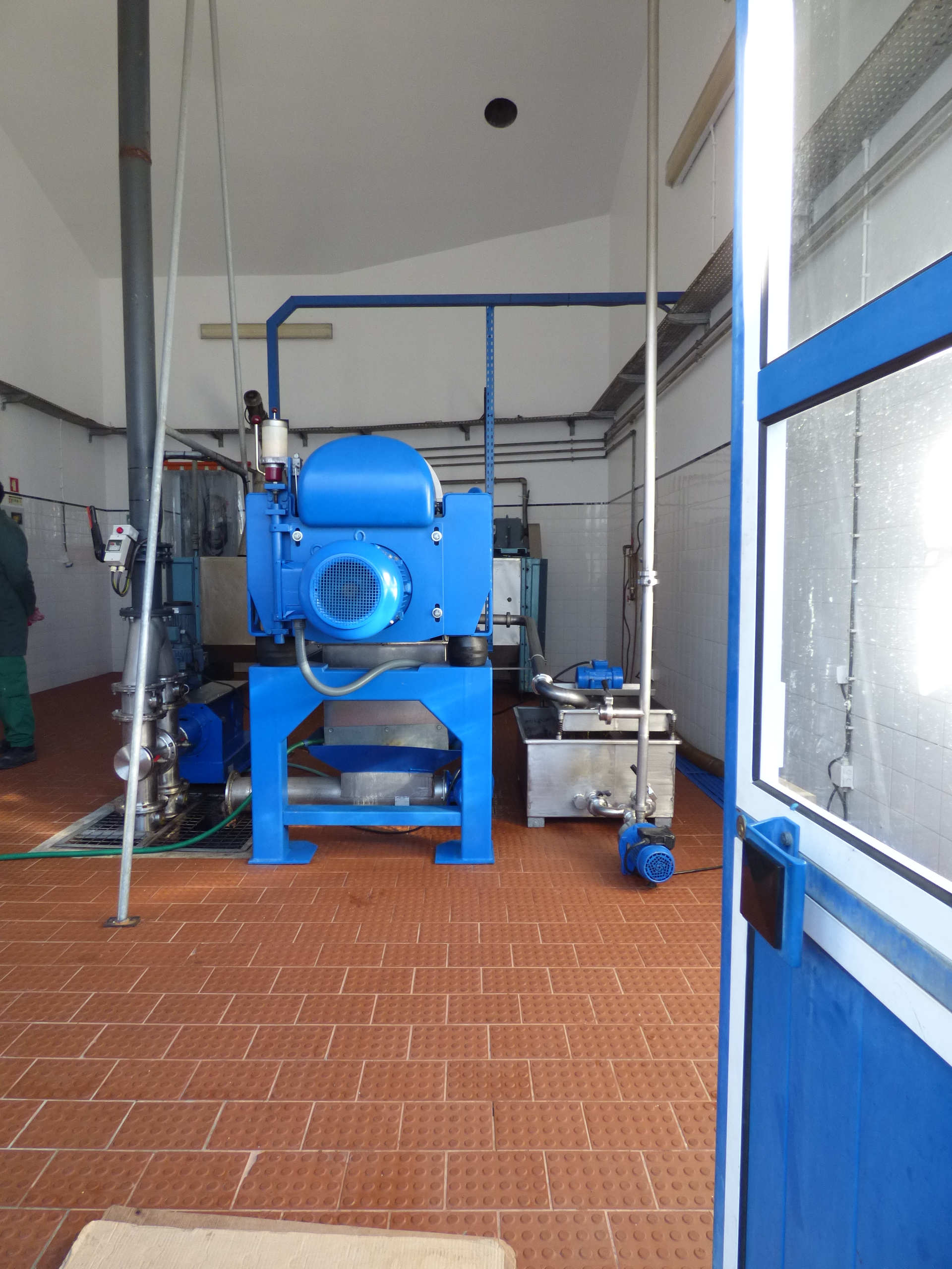 Les olives sont dirigées vers un gros cylindre inox : en bas à gauche en sort une pâte d'olive et de l'autre côté, une huile opaque et lourde.