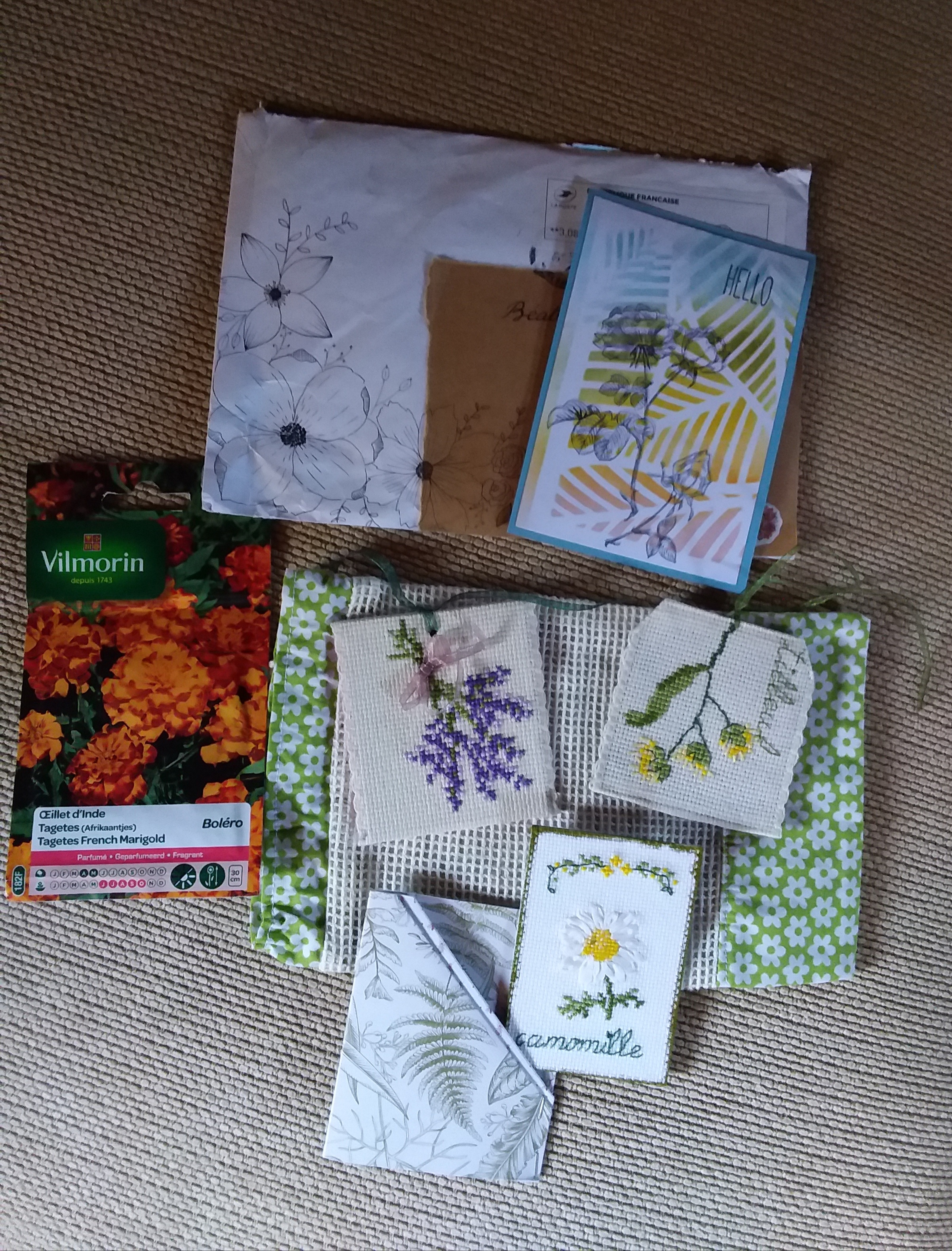 Blume m’a encore gâtée avec une carte ensoleillée, un sachet de graines d’œillets d’Inde que j’adore mettre dans mon potager, deux belles étiquettes brodées qui vont orner pour l’une, ma boîte à tisane, pour l’autre, un gros sachet de lavande et un sac en tissu dont j’aime beaucoup l’imprimé vert printemps.