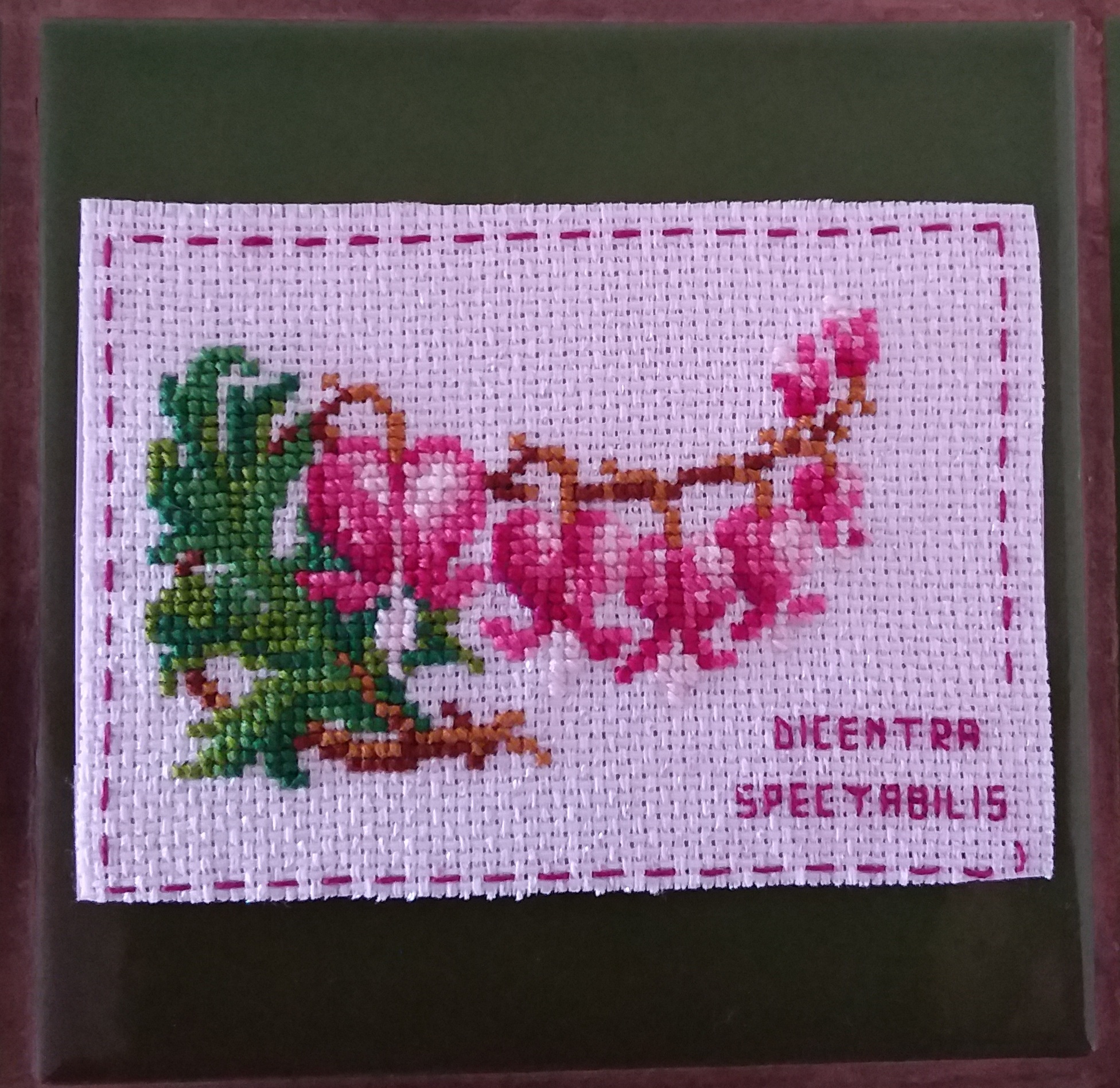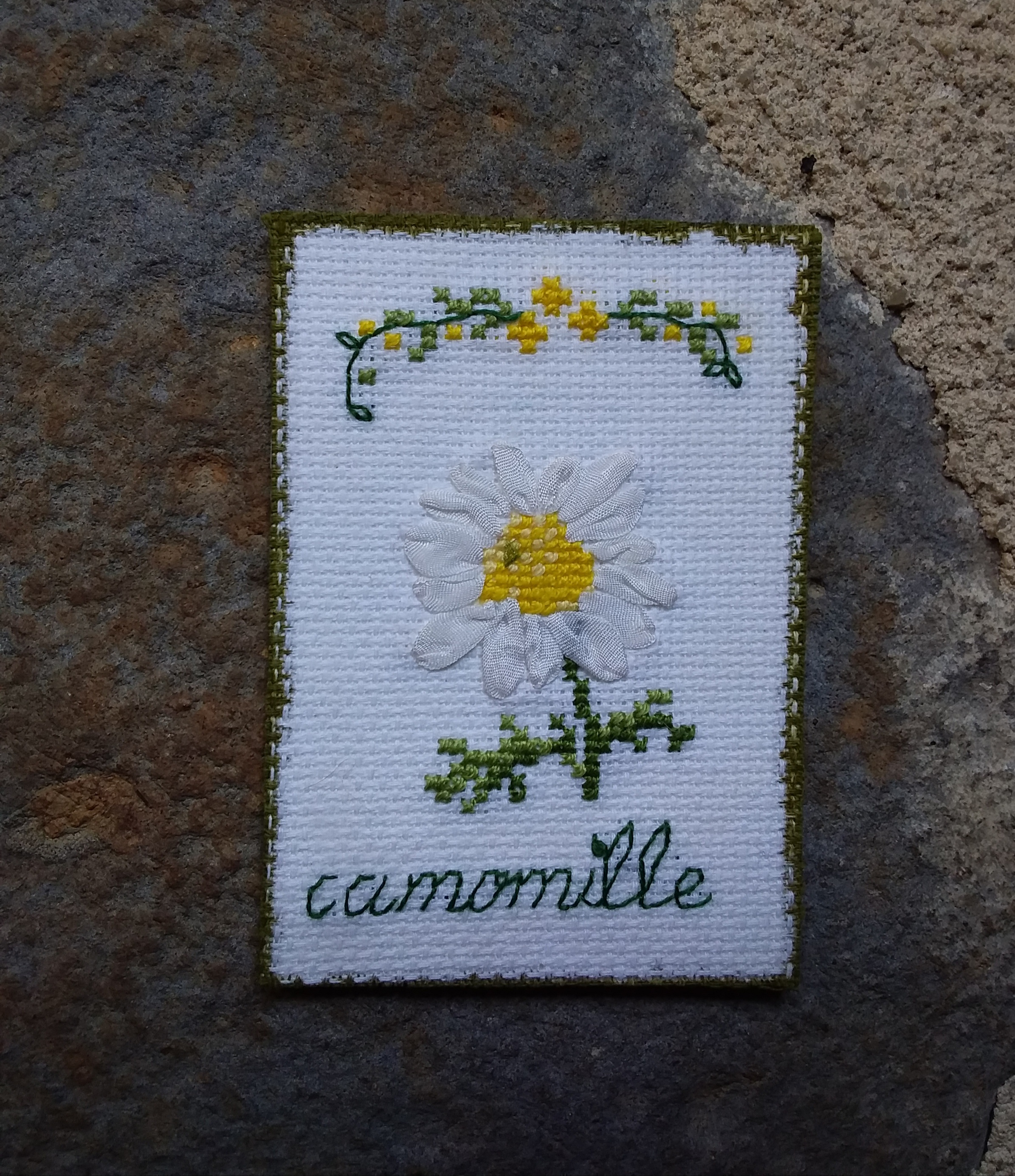 Pour ce mois de Mai, le thème était "fleur préférée ". Sans nous concerter, nous avons toutes les deux songé à un échange de plantes que nous avions fait par le passé, j’ai donc envoyé à Blume un rameau de Cœur de Marie et j’ai reçu une belle fleur de camomille en broderie au ruban.