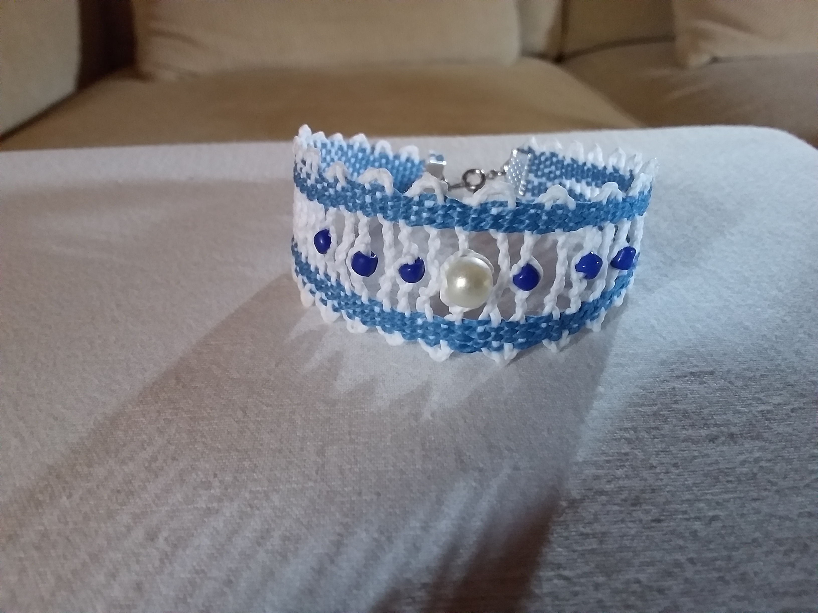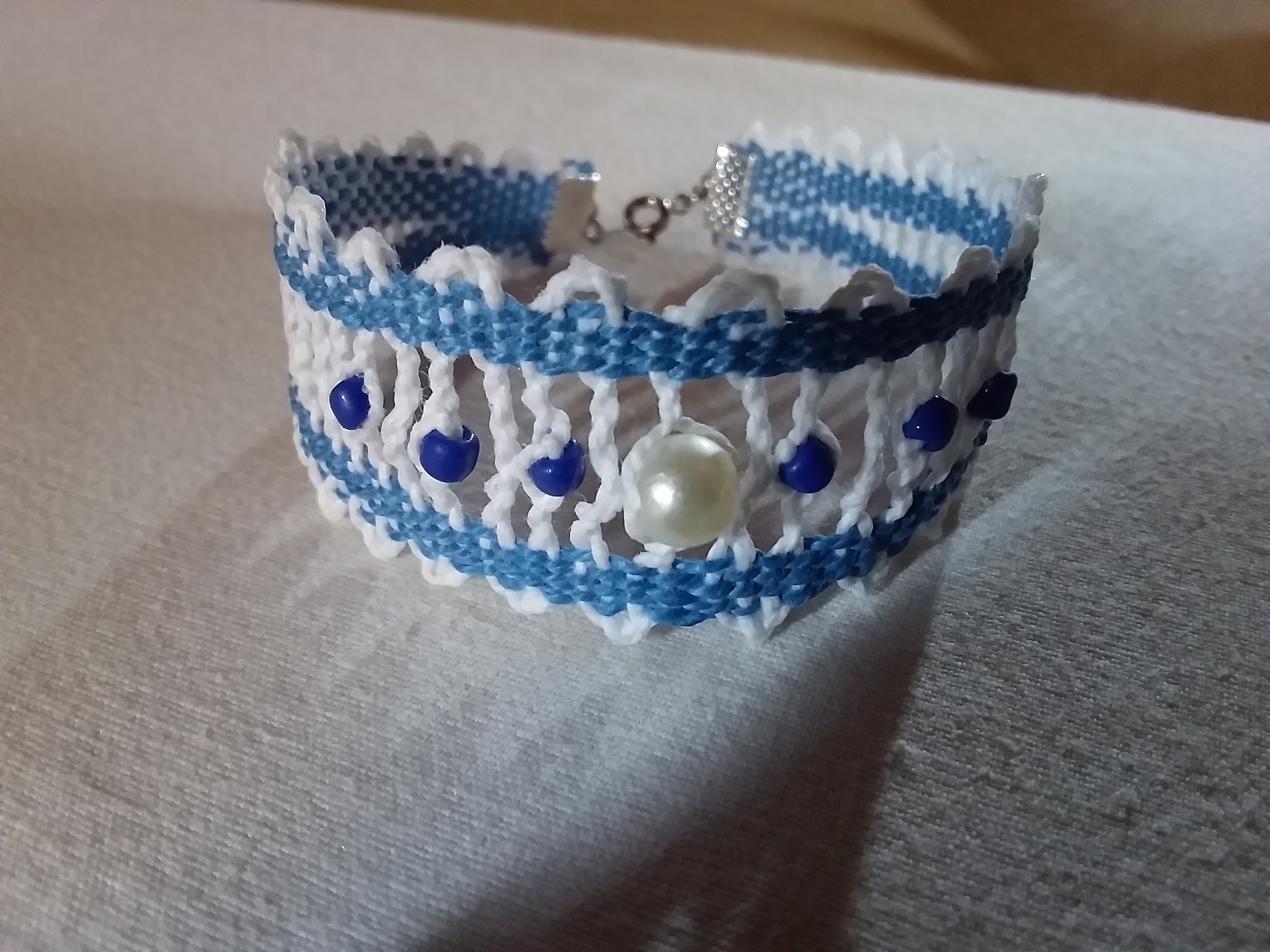 Ma dernière réalisation est un bracelet offert pour un anniversaire. Toujours en mat, avec l’ajout de torsions et de perles. Le tout est rigidifié au durcisseur tissu powertex..