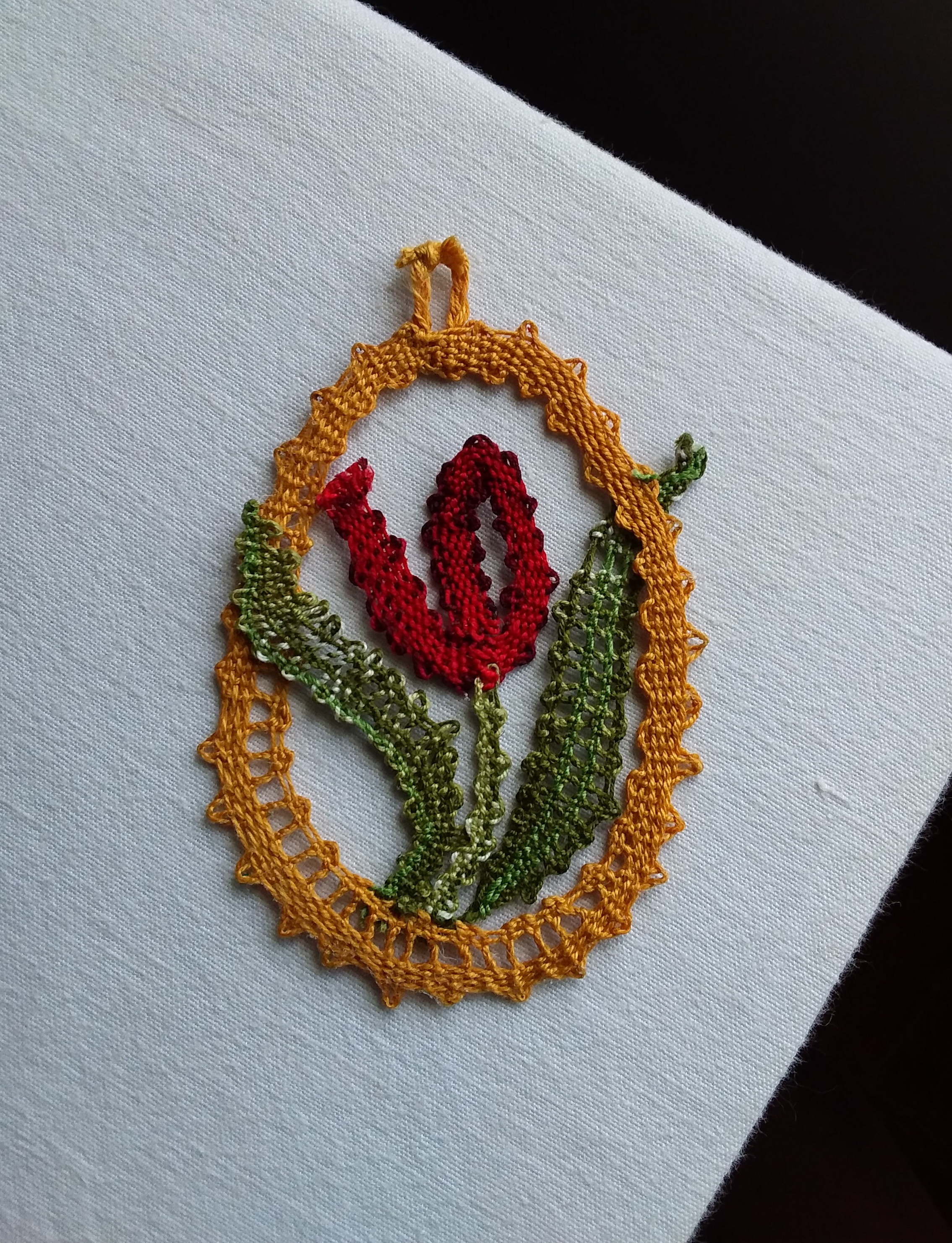 J’ai commencé l’apprentissage de la dentelle aux fuseaux il y a quelques mois déjà et en utilisant un seul point avec des variantes, j’ai réalisé un petit tapis pour ma roulotte de Luna, puis un petit plastron avec ajout de perles pour un corsage de poupée et une tulipe comme petite pendouille pour une carte.