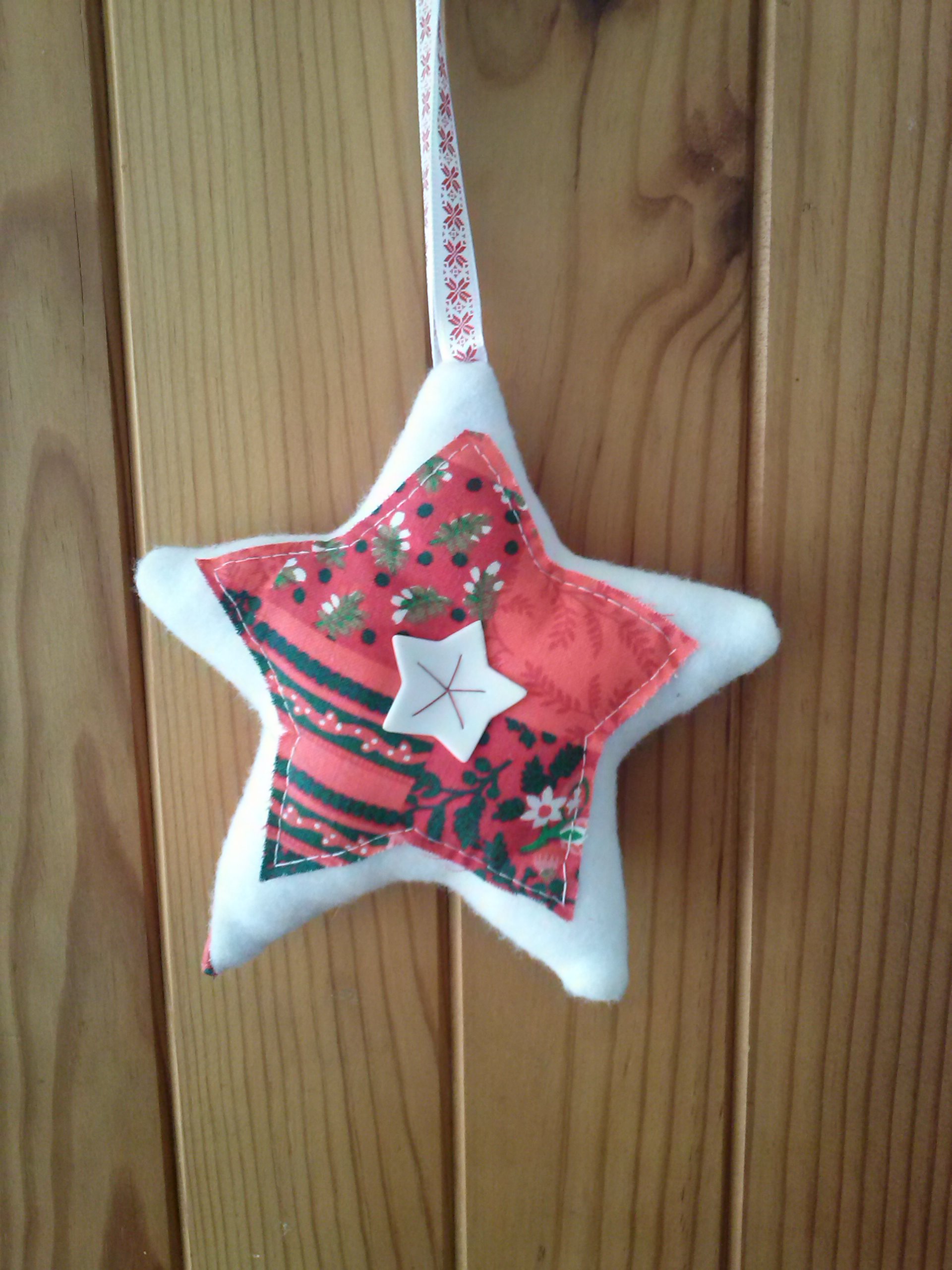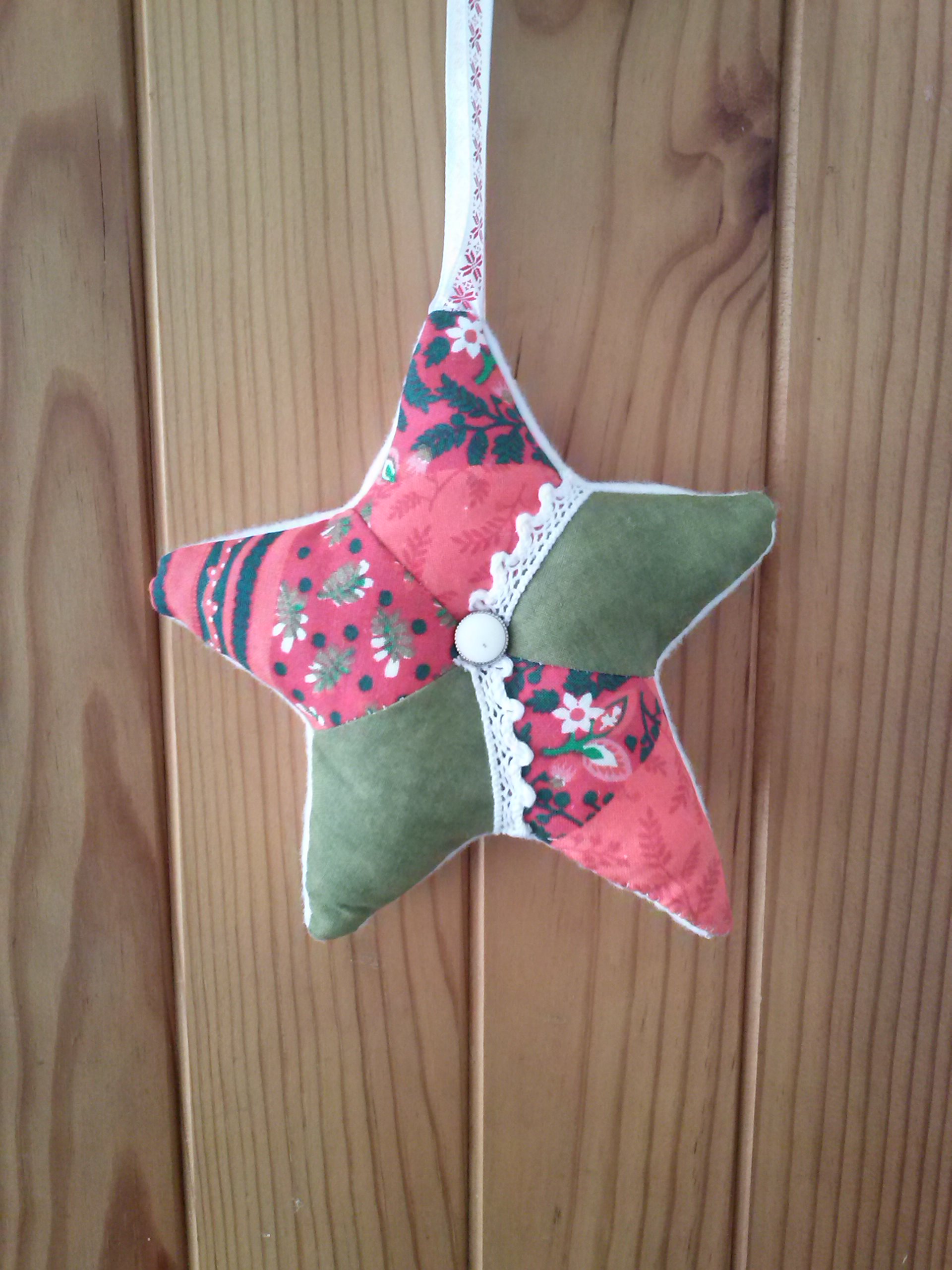 J'ai poursuivi mon idée de mobile étoilé et me suis lancée dans une étoile en patchwork dont voici les photos recto-verso (les couleurs ne sont pas très réalistes, le résultat est plus contrasté)